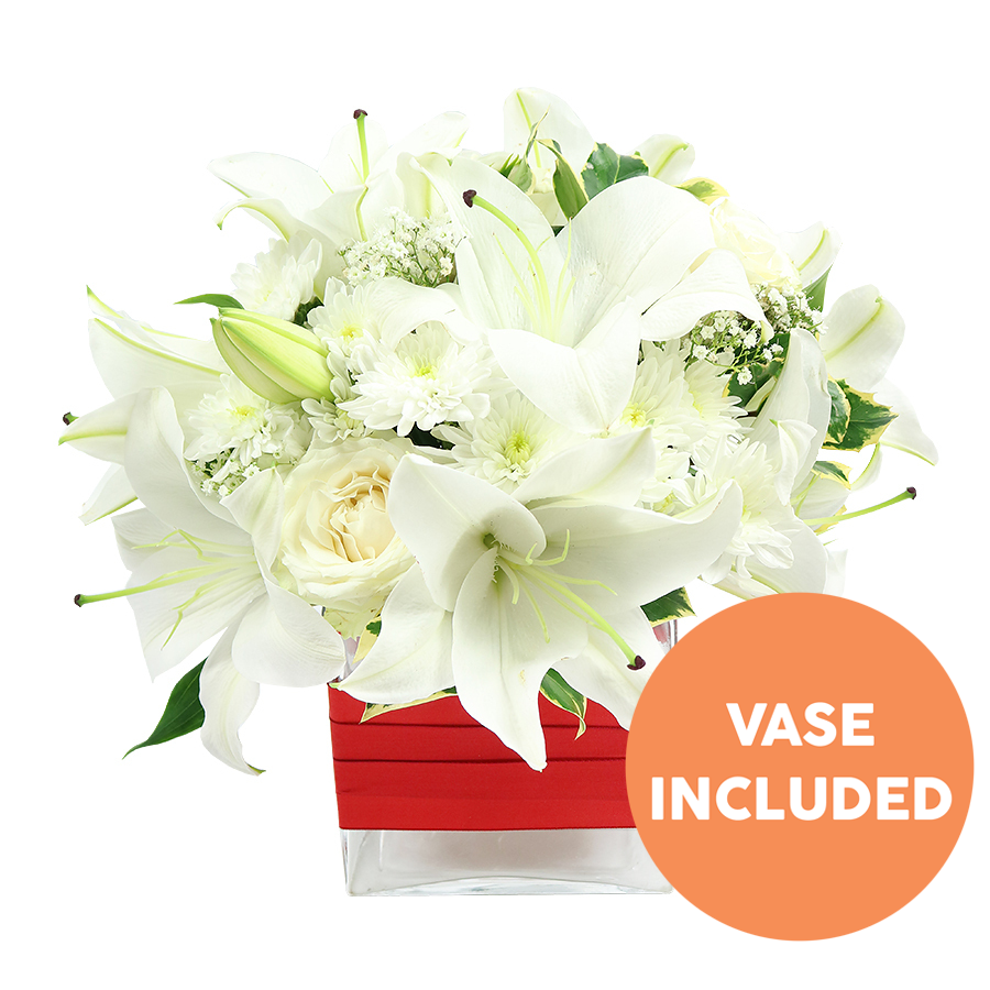 Experience the grace of our Luxury White Floral Symphony, a mesmerizing bouquet that blends white roses, liliums, chrysanthemums, and gypsophila with rich greenery.